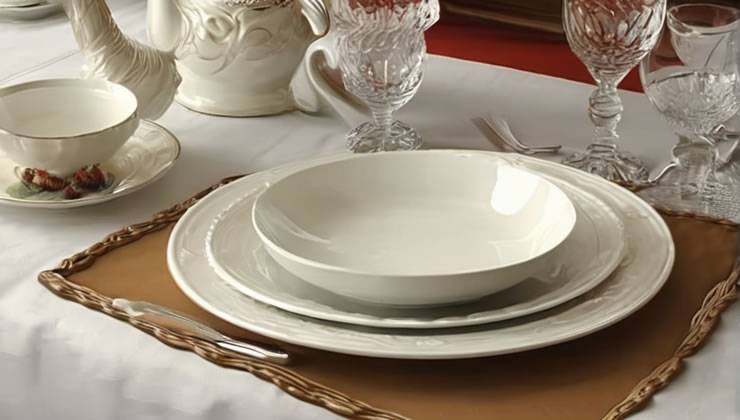 Первоначально на стол, накрытый основной скатертью, устанавливаются подставные тарелки (сервировочные). Они выполняют роль основы для всей последующей композиции.